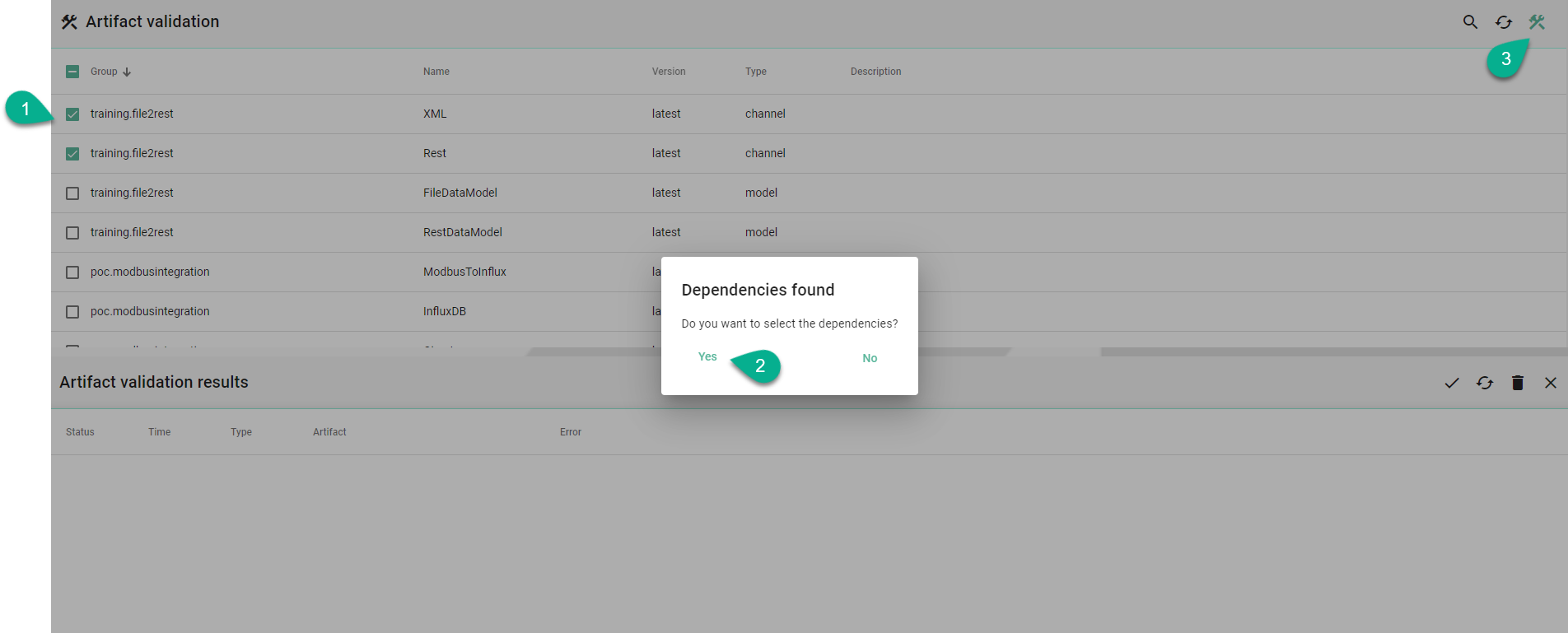 From the Artifact Validation perspective select the desired artifacts (1)