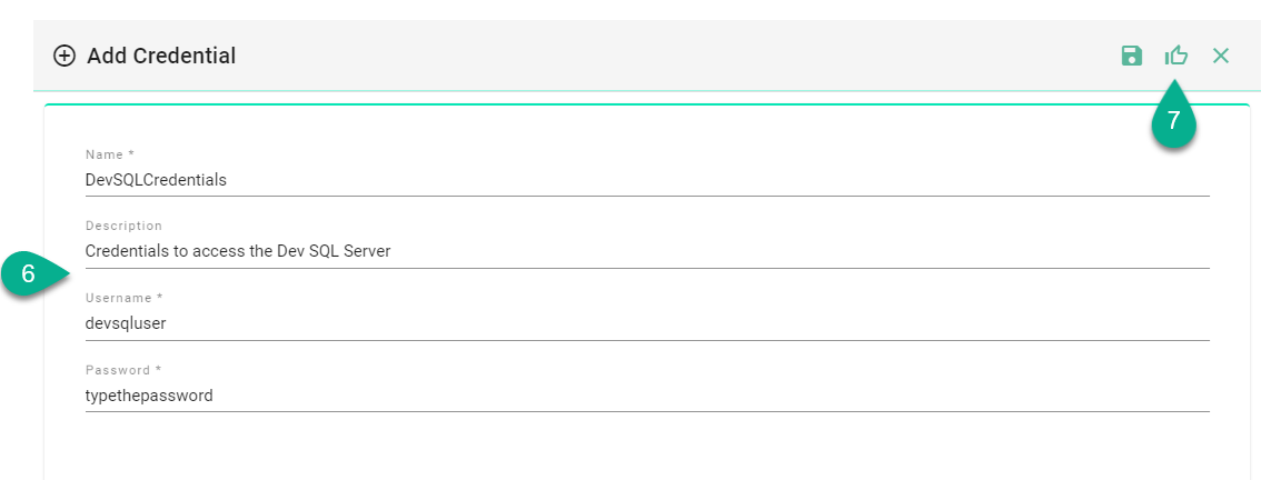 Input the credentials details (6) and click on the Save and Close button (7).