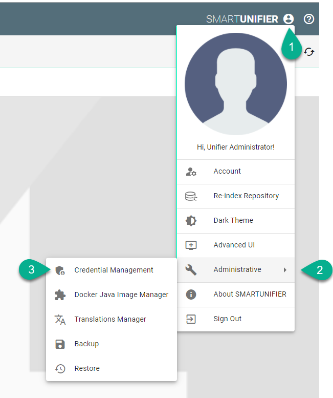 Click on the Account icon (1), go to Administrative section (2) and select the Credential Management option (3).