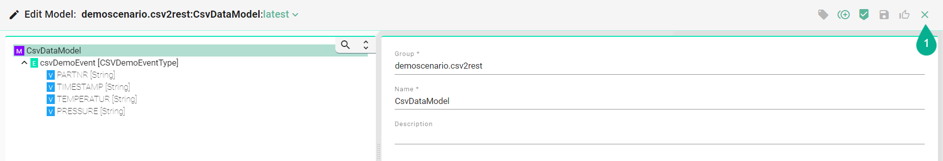 After applying input data while editing a component, changes can be saved and edit mode exited by clicking the Save and Close button (1).