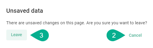 If the data is unsaved, a pop-up will appear, offering the option to click the Cancel button (2) to return to edit mode and save the data, or the Leave button (3) to exit without saving.