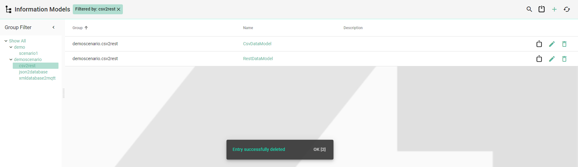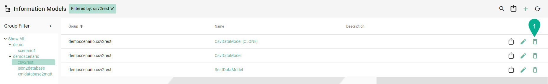A component can be deleted by clicking the Delete button (1).
