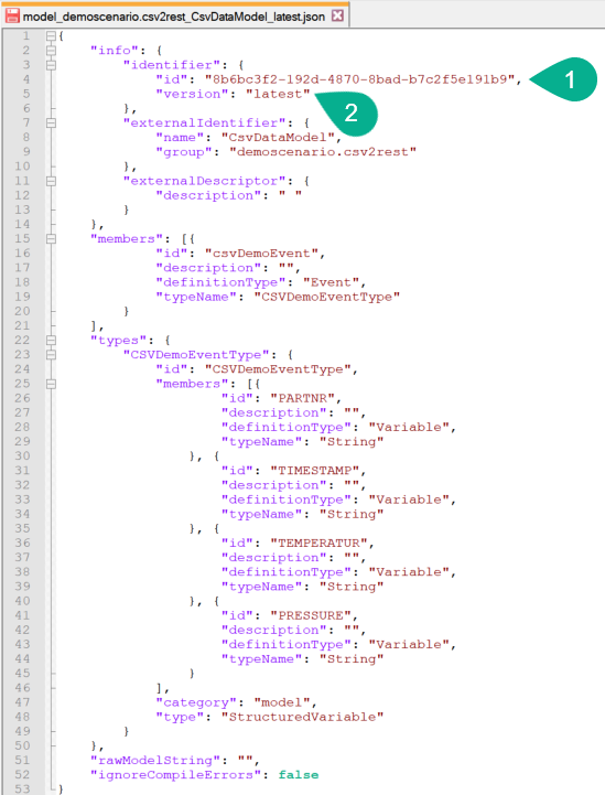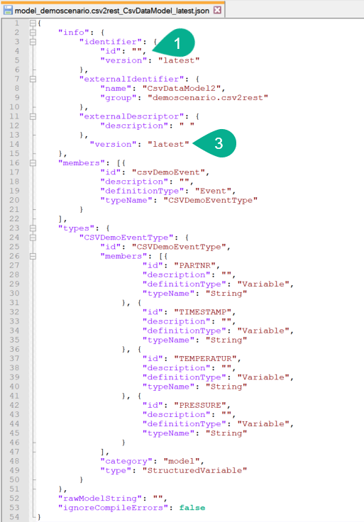 To import an exported component, first open the JSON file and remove the component id (1); upon import, the database will assign a universally unique identifier (uuid). Additionally, copy (2) and paste (3) the version into the info section, as illustrated below.