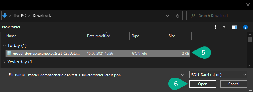 Select the file (5) and then click the Open button (6).