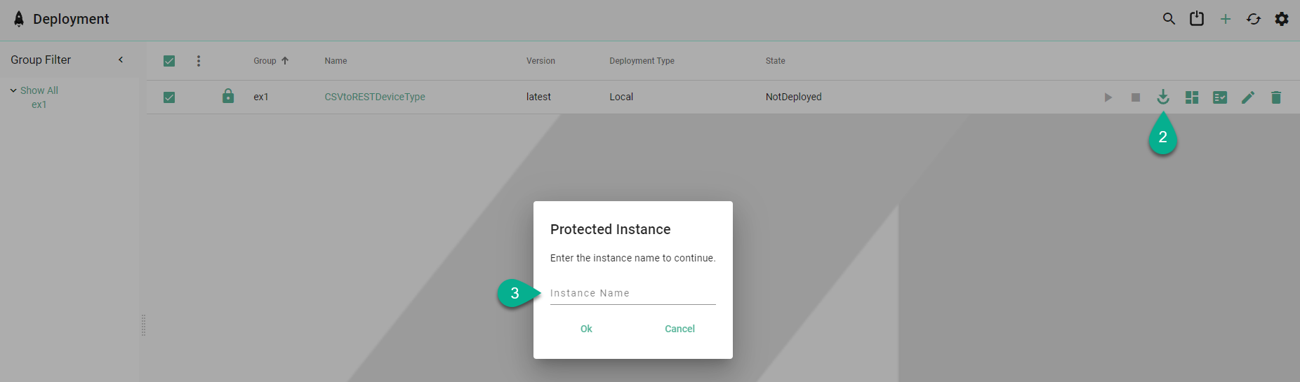 Now the Instance is protected, meaning that when the user performs an action like Deploy (2), a popup appears requiring to input the Instance name (3).