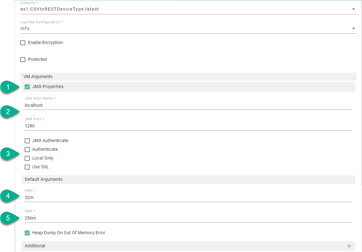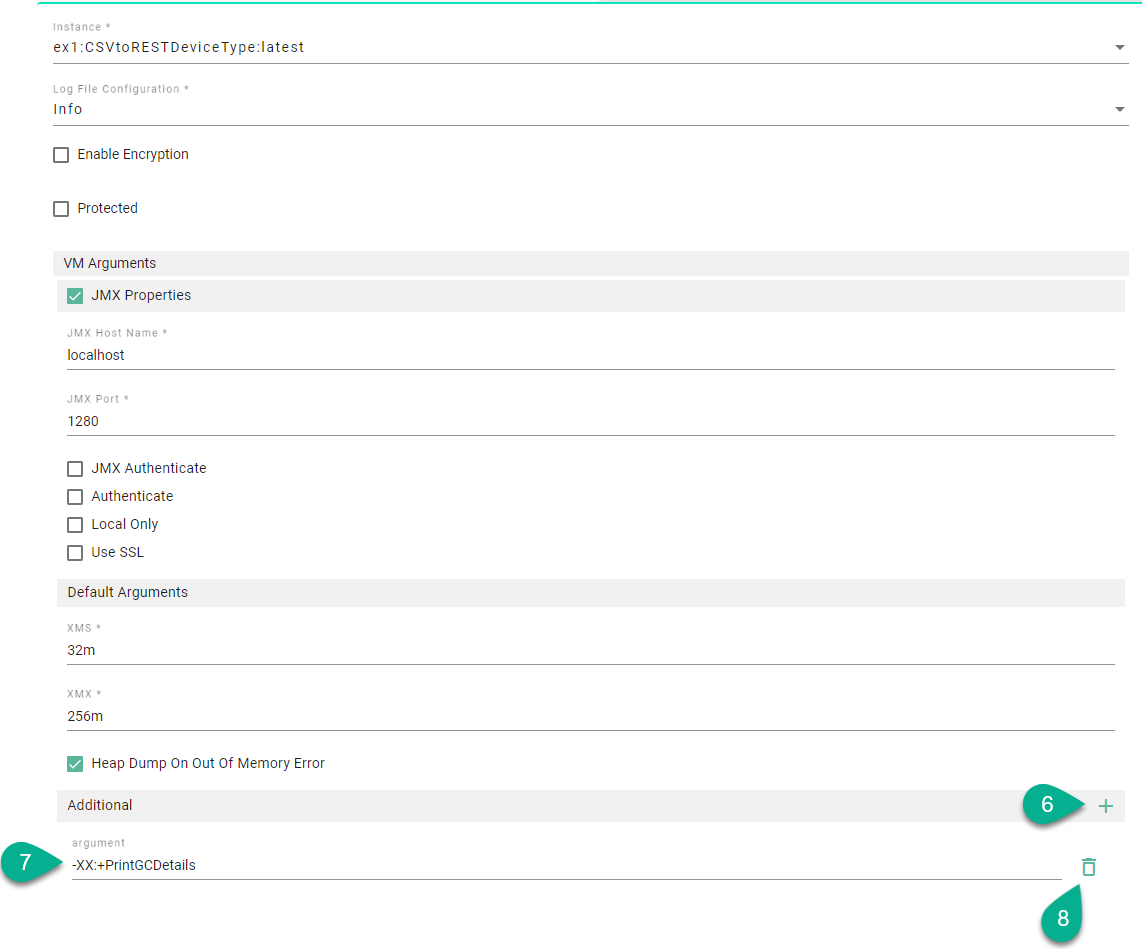 Additional JVM arguments can be added by selecting the add Arg button (6) and input the argument (7). For example, to debug memory issues or application performance, the Garbage Collection logging can be enabled in JVM, as seen below.