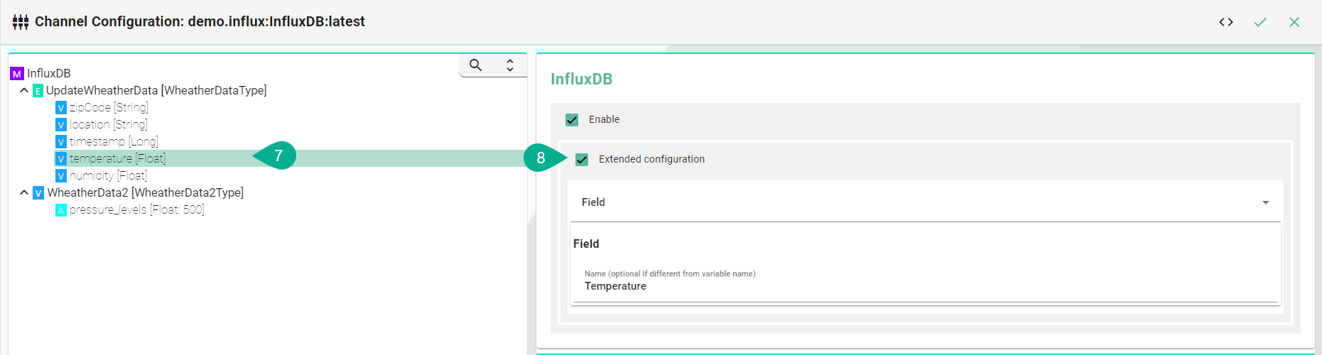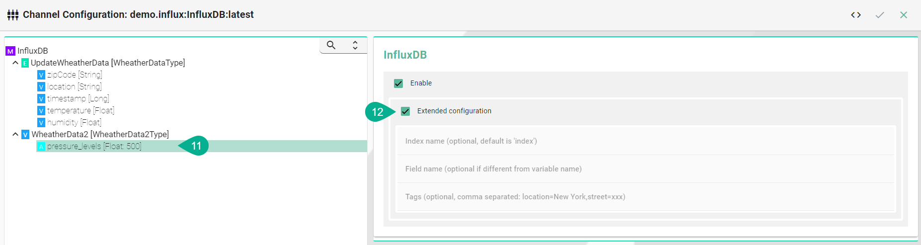 Fields represent the actual data stored and consist of key-value pairs. Unlike tags, fields aren't indexed. Variables not explicitly configured are automatically recognized as fields by the InfluxDB Channel.