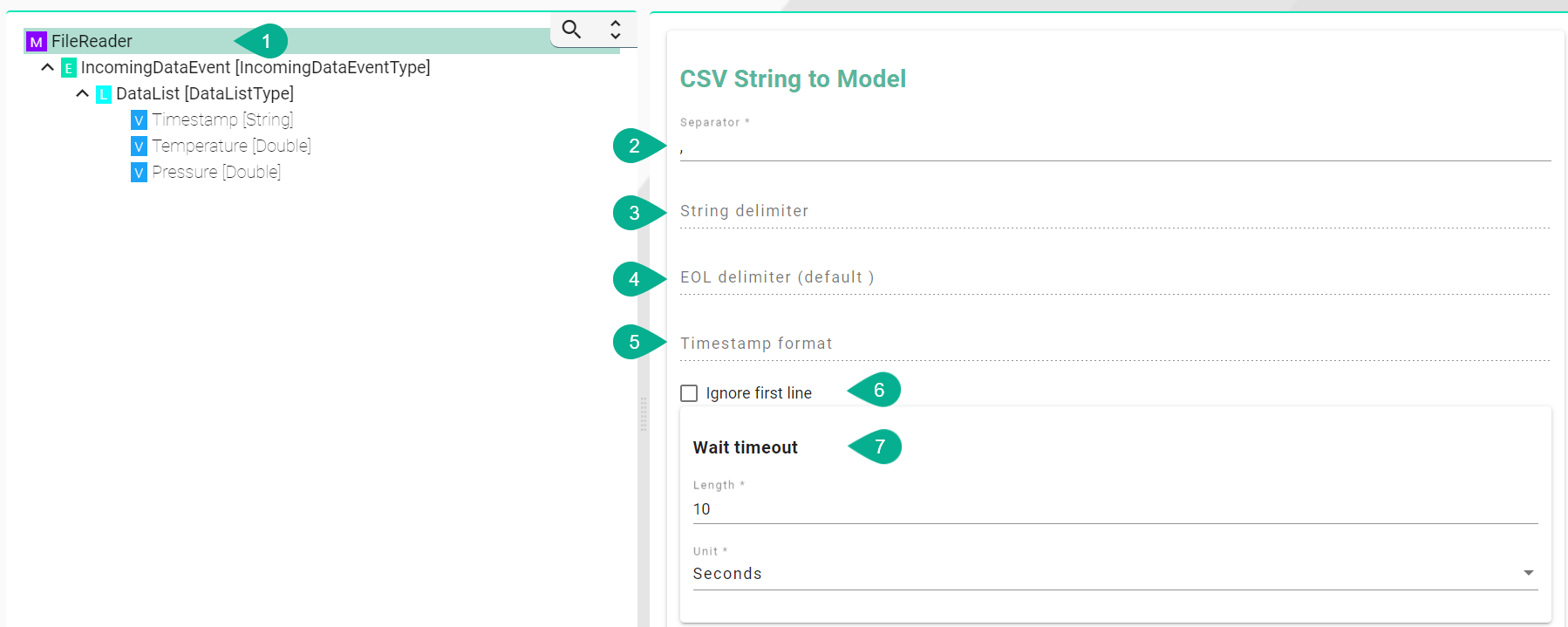 The CSV to Model layer converts CSV data into a structured model representation. It allows to configure various options such as separator, string delimiter, and timestamp format for parsing the CSV file.