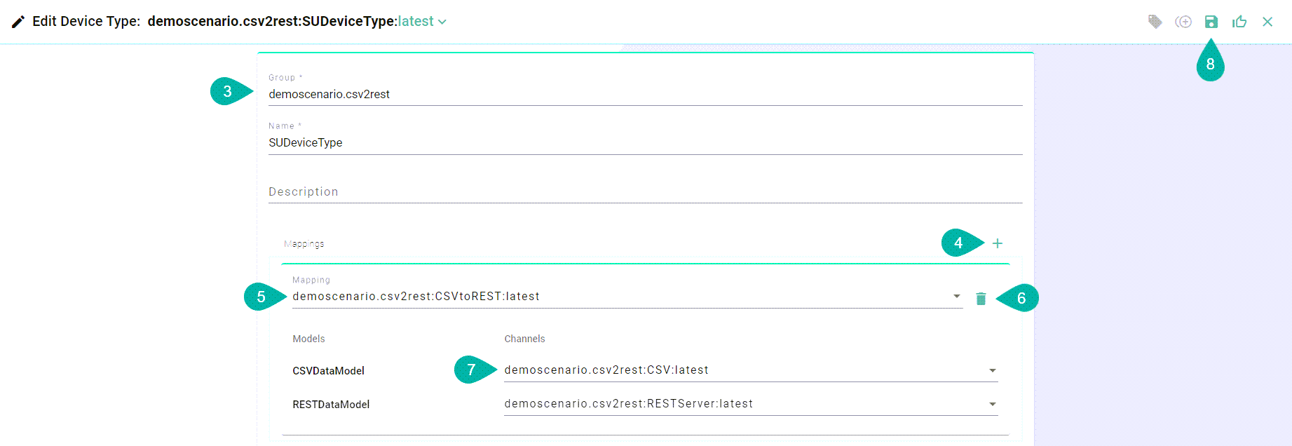 To save the new Device Type, click the "Save" button located in the top right corner of the screen (8).