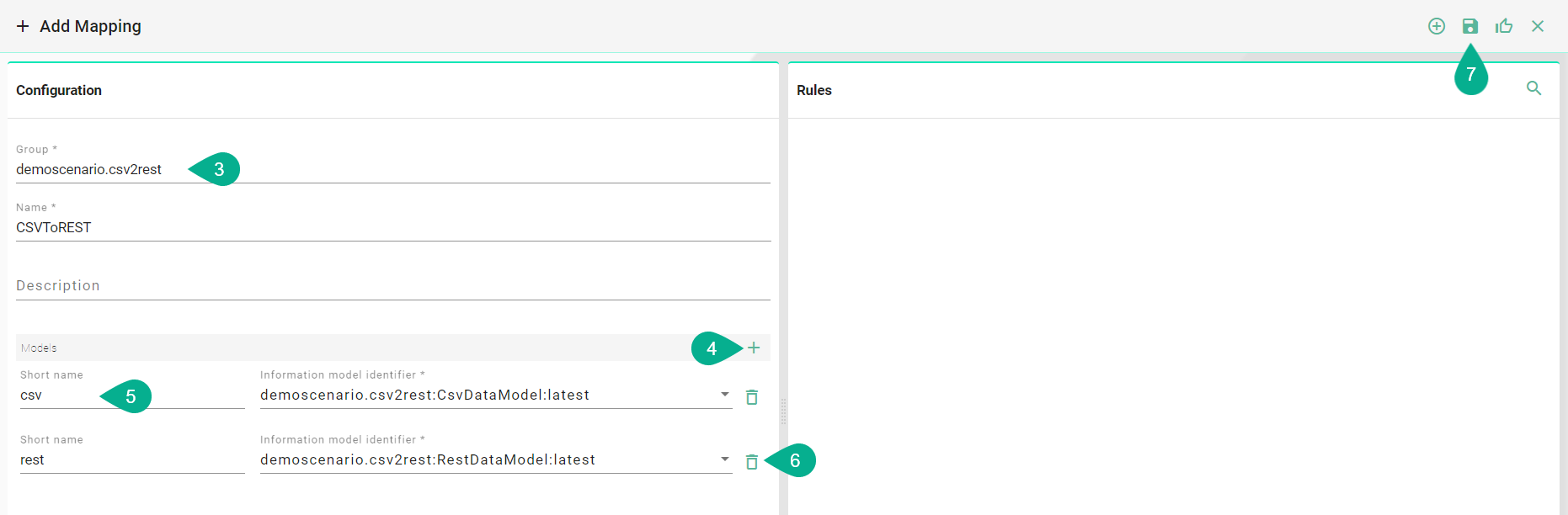 Once all mandatory fields have been filled in, the "Save" button located in the top right corner will be enabled. Click this button to submit the new Mapping (7).